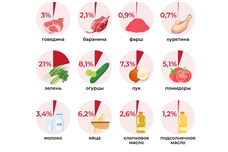 С начала 2024 года наблюдается наиболее значительное увеличение цен на говядину (+19,7%), фарш (+19,3%), баранину (+12,9%), молочные продукты (+8,3%) и подсолнечное масло (+5,9%). Например, цена на говядину достигла $8,64 за килограмм, что составляет 92 сомони. В то же время, цены на овощи несколько снизились, например, картофель стал дешевле на 2,4%.